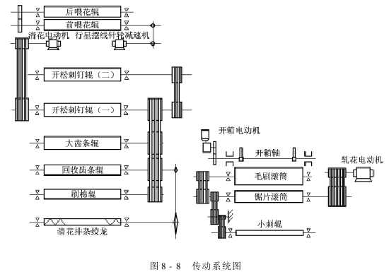 传动系统如图8-8所示,它由行星摆线针轮减速机带动前后喂花辊;由6极电动机带动清花部齿条辊筒;电动推杆电动机实现开箱、合箱工作;由4极电动机带动锯片滚筒及毛刷滚筒。