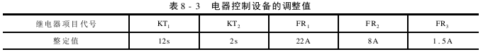 按钮盒和控制柜内的电气元件出厂前均已连接好,只要按随机所带的有关资料,将按钮盒/控制柜到所有用电设备及电气元件的导线,按要求接好即可。接好线后,应用兆欧表或万用表检查所有电动机/电气元件和线路,为防止出现断路和短路现象,还应按表8-3将KT(时间继电器)和FR(热继电器)的整定值进行调整。