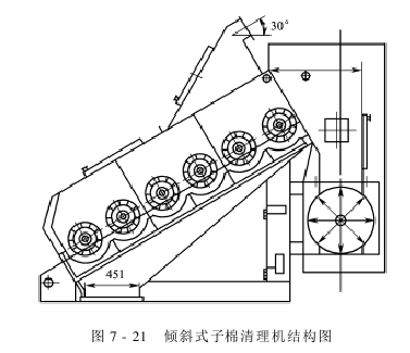 清铃壳机也称提净式子棉清理机。实际上是除铃壳机和除棉秆机的联合机,其上部是除铃壳机,下部是除棉秆机。主要部件有:3个抛掷输送器、1组大齿条辊、10组排杂棒、1组大刷棉辊、3组小刷棉辊加3组U形刺条辊、格条栅、杂质输送绞龙等。