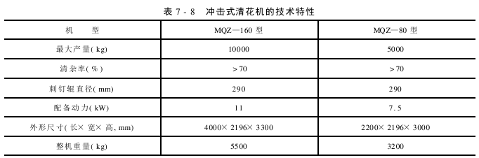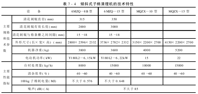 6MZQ系列和MQZX系列倾斜式子棉清理机的技术特性见表7-4。
