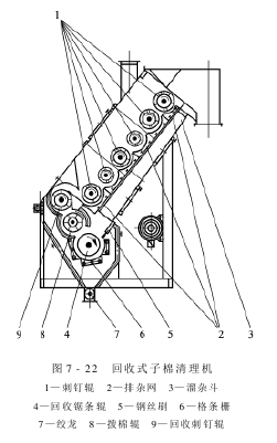回收式子棉清理机是一种组合式子棉清理机,清理部分有刺钉滚筒清花单元,回收部分有齿条滚筒单元。该机主要由清理部分、回收部分及传动系统组成,如图7-22所示。