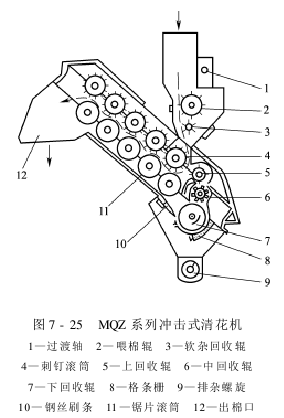 MQZ系列冲击式清花机的结构,如图7-25所示。它由喂棉、开松除杂、落棉回收等部分组成。