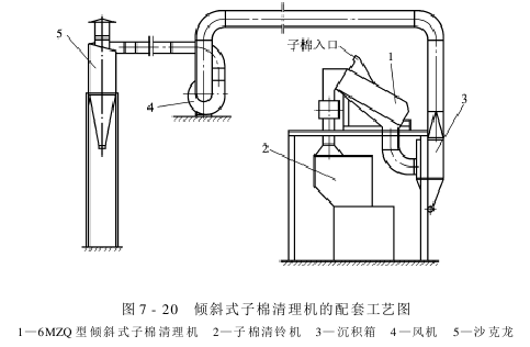 子棉在风机负压气流的吸引下,进入倾斜式子棉清理机内,喂给清花刺钉辊,在清花刺钉辊的冲击作用下,子棉被打击,由下至上向前滚动。与此同时,子棉被开松、振动,粘附在子棉表面的外附杂质在重力、离心力的作用下,通过格条栅摩擦、撞击,从格条栅间隙中排出,排出的杂质在风力及重力作用下,进入沉积箱。由于沉积箱容积增大,风速降低,大量的杂质因重力作用而沉降在沉积箱中,一些细小的尘杂随风通过风机进入沙克龙中,进一步对含尘空气进行清理,细小的尘杂落入杂质收集装置,洁净的空气排入大气中。经过清理的子棉通过阻风阀进入子棉清铃机或其他清理设备进一步清理。