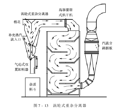 (2)该重杂分离器与负压拉过式塔式烘干机联合使用,为第二道烘干提供了热气流喷射点。道烘干中的2/3气流量用于将子棉从棉模喂入器中提起,剩余1/3的热气流,用于涡轮式重杂分离器的底端,通过两个喷射点将气流注入到子棉中。