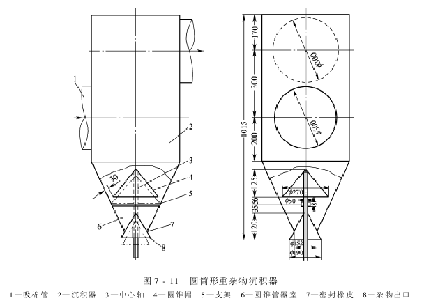 子棉管的进棉端以水平或微倾斜状与锥筒上端连接。出棉端又通过渐扩管以垂直状与圆筒顶面连接。当子棉随气流进入重杂物沉积器时,子棉中重杂物的惯性比子棉大,继续按原有的运动方向运动,直至撞到圆筒和锥筒的侧壁。加之沉降室过流断面面积的突然扩大,气流速度显著下降,只有子棉能被悬浮带走,重杂物只能向下坠落。