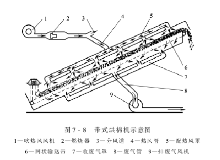 管道型、喷泉型烘棉机虽然比多层塔式烘棉机效率有很大提高,节能效果也很明显,但它们的烘棉原理和多层塔的形式基本上一样,即用热风输棉烘棉。作业时只能控制风温和风量,不能控制烘棉时间,子棉接触热风时间只有5~6s。带式烘棉机能控制烘棉机的烘棉时间,提高烘棉效果。它是当今新技术的烘棉机。