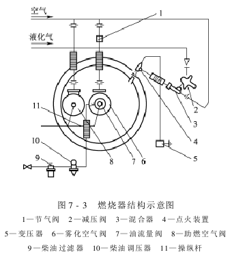 以柴油作热源的燃烧器一般由点火系统、燃烧系统、助燃雾化系统和供油系统组成,图7-3是其结构示意图。