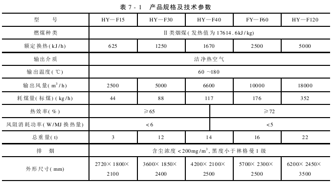 产品规格及技术参数见表7-1。系统装机容量和重量将根据用户要求的供热量及供风温度有所变动。