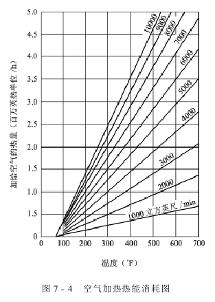 例如,要求每小时加热15300m3 的空气(约9000立方英尺/min),加热后空气的温度为121℃(约250u),查图7-4可知,每小时消耗的热能约为184.5MJ(约1750000英热单位)。