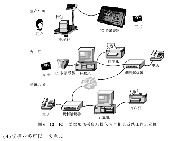 这套报表系统的基本构成主要分为加工厂和棉麻公司(棉麻站)两部分。加工厂部分,包括放在车间内与电子秤直接相连的IC卡数据采集器和放在棉检室的1台运行码单报表程序的计算机。棉麻公司部分主要是1台运行远程报表程序的计算机。两部分通过电话网实现远程数据传送,其工作示意图如图6-12所示。