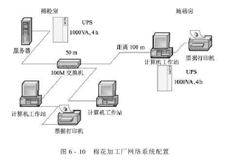 《子棉收购计算机网络系统》由计算机网络硬件系统和收购软件系统组成。硬件系统包括服务器、计算机、100M网络、长延时不间断电源(UPS)等。收购软件系统包括地磅房过秤系统、棉检室检验录入系统、结算室结算系统、统计室统计报表系统、排号系统以及数据服务系统等,如图6-9所示。
