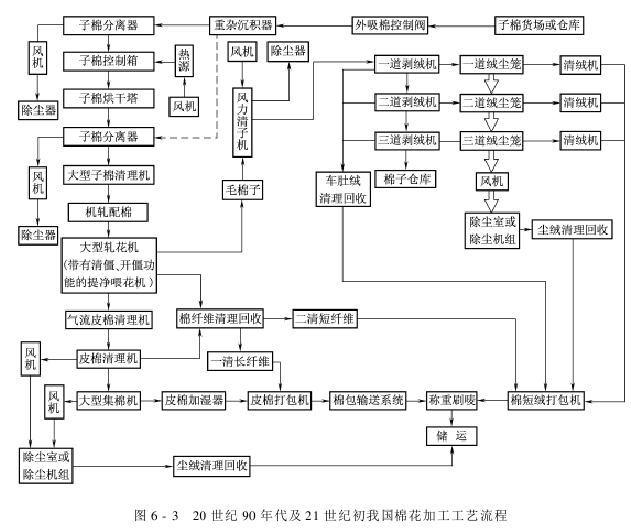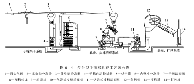 根据2004年发布的《棉花质量检验体制改革试点企业棉花加工技术规程》要求,棉花加工工艺如下: