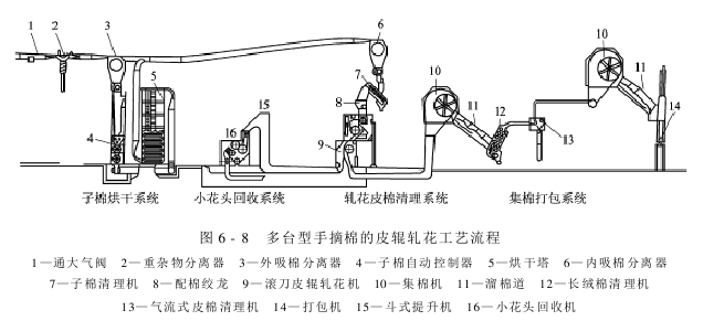 由于机采棉中的外附杂质较手摘棉高出几倍,子棉含水率又较高,故轧花前的子棉需经过多次清理和1~2次的烘干,轧花后的皮棉需经过2次或更多次的清理。