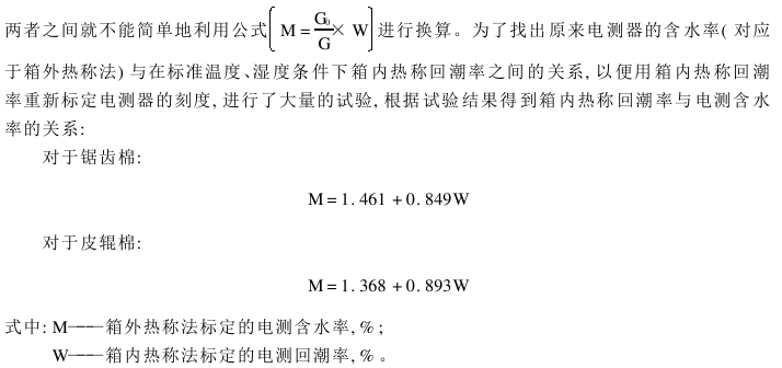 根据现行棉花国家标准(GB1103—1999、GB1103.3—2005、GB19635—2005)规定,检验水分使用水分电测器,以标准烘箱作为校正水分电测器的依据。