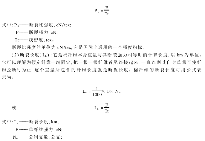 (1)断裂比强度(P S ):它是指未应变的纤维试样,单位线密度(Tt)所承受的断裂强力(F),其公式为: