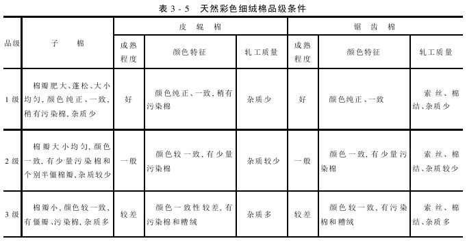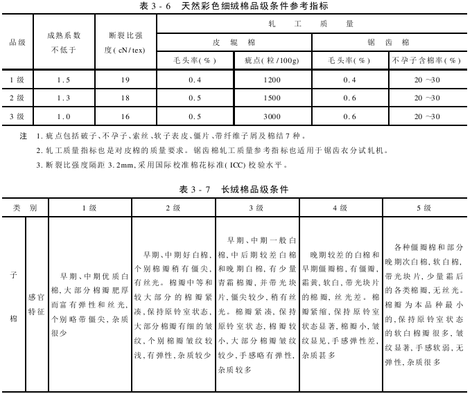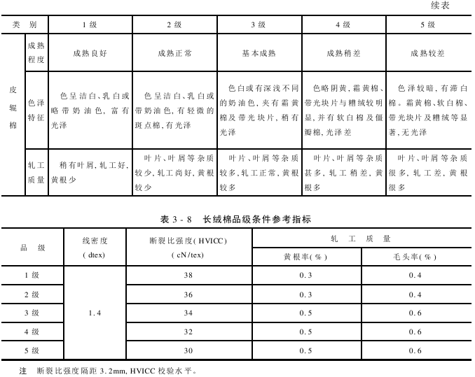 依据成熟程度、色泽特征(彩棉检验中为颜色特征)、轧工质量三个主要指标及品种的不同而设有辅助参考指标,细绒棉、天然彩色细绒棉及长绒棉标准具有不同的文字性描述品级高低的指标,见表3-3~表3-8。