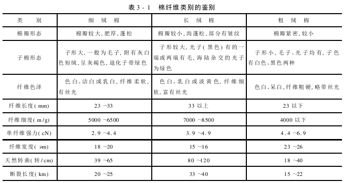 检验棉纤维类别,一般采用感官检验法。将棉样放在工作台上,视子棉、棉子和纤维的外观形态、手感及纤维的粗细、软硬、软滑程度以及手扯长度等来决定。如有条件也可通过仪器测定纤维的长度、细度、强度、马克隆值、天然转曲数等项目,并结合棉纤维外观形态加以鉴定,详见表3-1。