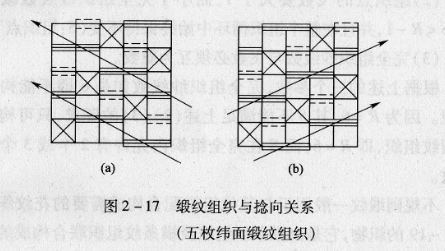 以五枚纬面缎纹为例,如图2-17(a)、(b)所示。纬面缎纹一般纬密大于经密,织物正面由纬纱覆盖。这类织物表面是否呈现斜纹路主要取决于纬纱的捻向与缎纹组织的主要斜纹倾向之间的关系。图2一17中箭头所示为主要斜纹倾向(两根纬纱之间有两个组织点连接),如纬纱为Z捻,纬纱段上的反光带斜向将与图2-17(a)图中的主要斜纹倾向相反,则使织物表面不呈现斜纹。为此5/3横贡缎织物宜采用图2-17(a)组织,不宜采用5/2纬缎纹组织,如图2-17(b)所示,否则织物表面将会出现斜纹效应。