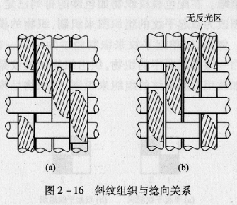 答:斜纹类织物,在织物组织结构、经纬配置、原料等条件相同的条件下,在同样的光照条件下,根据前面阐述的“反光带”理论,斜纹纹路的清晰度与纱线捻向的配置有密切的关系。如果使斜纹方向与“反光带’’斜向相一致,则“反光带”连成一线。斜纹纹路就显得醒目而清晰,如图2-16所示,图2-16(a)为2/2↖,图2-16(b)为2/2↗,织物经密大于纬密,经纱的捻向为z捻,由于“反光带”的斜向与纱线中纤维方向是互相垂直的,图2-16(a)与(b)中每一经纱浮长段上的反光带形状、面积均相同,但图2-16(a)的2/2↖有良好的斜纹效果,(b) 2/2↗斜纹效果很差,有模糊不清的感觉。原因就在于2/2↖的斜纹方向与纱线上的反光带斜向一致。由于通常单纱用“Z”捻,因此一般单纱织物采用左斜纹。