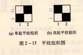 答:平纹的组织图在所有的组织图中为简单,其Ri=Rw=R0= 2。一般绘作平纹的组织如图2-15(a)所示,即根经纱与根纬纱交织,经纱浮在纬纱上成经组织点。而图2-15(b)所示的平纹组织则是第1根经纱浮在第2根纬纱上,即第1根经纱与第2根纬纱交织成经组织点。图2-15(a)、(b)两平纹组织图其经组织点的起始点不同,为此称图2-15(a)组织图为单起平纹,而图2-15(b)组织图为双起平纹。单起平纹与双起平纹的作用,在于其分别与其他组织的配合或与色纱排列的配合,使织物的花纹清晰或模纹发生变化。如丝织物中平地纬起花提花织物,其平纹地组织必须要用双起平纹组织,而经起花提花织物则要用单起平纹组织,否则织物上的花纹边界将不够清晰。在配色模纹织物如色纱的排列已定,而若把单起平纹的组织图改为双起平纹的组织图来织制,织物的模纹就会呈现根本的变化。例如,以单起平纹来织制经纱为一黑一白排列顺序、纬纱则是一白一黑排列顺序的织物,织出织物的模纹是黑白间隔的纵条纹。但如改用双起平纹的组织来织制,则织物呈现为黑白间隔的横条纹了。