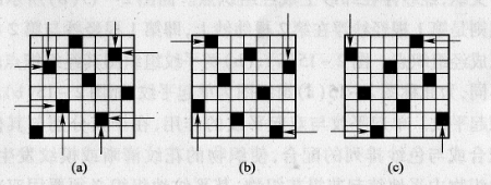 答:绘制方格组织织物组织图,欲使位于对角位置的组织点连续,采取的方法为:应使基础组织根与末根经纱上的两个组织点距上、下边缘相等,使根与末根纬纱上的两个组织点距左、右边缘相等。为此,可以通过观察基础组织相邻两根经(或纬)纱的办法,来找出适合于作根与末根的经纱(或纬纱)。现以一纬面缎纹为基础组织为例来说明,如图2-14(a)所示,经观察,第6、第7两根纬纱上的两个组织点距左、右边缘相等,如图中箭头所示,故取第7根纬纱作为根纬纱,第6根纬纱作为第8根纬纱(也可以取第3根作为第1根纬纱,第2根作为第8根纬纱)。同理第2、第3两根经纱上的两个组织点与上、下两边缘距离相等,如图中箭头所示,故以第3根作为第1根经纱,第2根作为第8根经纱(也可取第7根经纱作为第1 根,第6根作为第8根经纱)。经如此调整后的基础组织如图2-14.