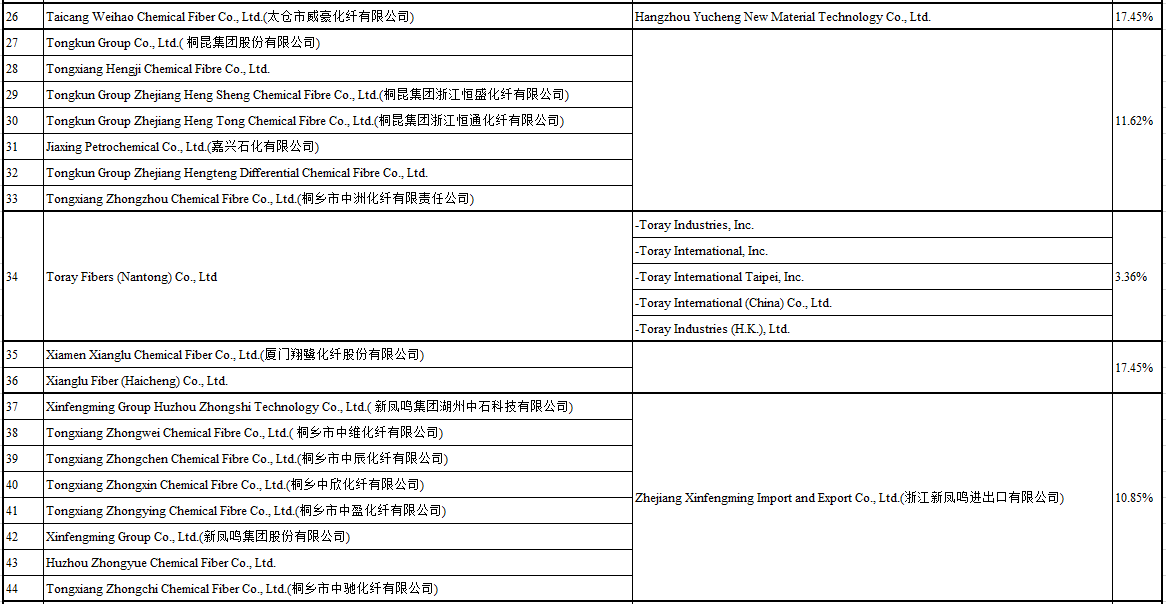 2021年9月1日,越南工贸部发布第2080/QD-BCT号决议,对进口自中国、印度、印尼、马来西亚的聚酯长丝纱线作出反倾销肯定性初裁,初步裁定对涉案产品征收临时反倾销税,其中中国涉案产品的税率为3.36-17.45%(详见下表)、印度为54.90%、印尼为21.94%、马来西亚为21.23%。涉案产品的越南税号为5402.33.00、5402.46.00、5402.47.00。本案倾销调查期为2019年全年,损害调查期为2017年至2019年。措施自公告发布3日起生效,有效期不超过120天。