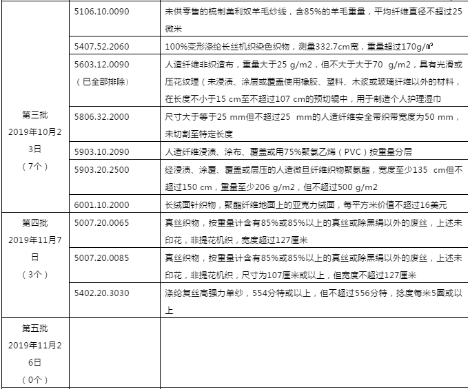 本次排除的纺织品描述与HS码如下: