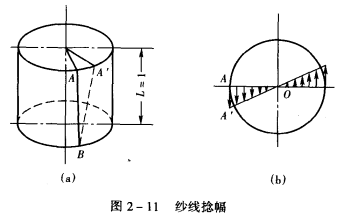 所以捻幅实际上是这一点的捻回角的正切。为了方便,常作出纱线的截面分布图,如图2-11(b),图中箭头的长短表示捻幅的大小,箭头的方向表示加捻方向。