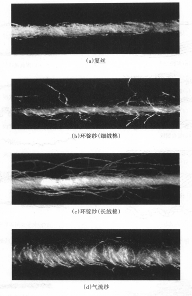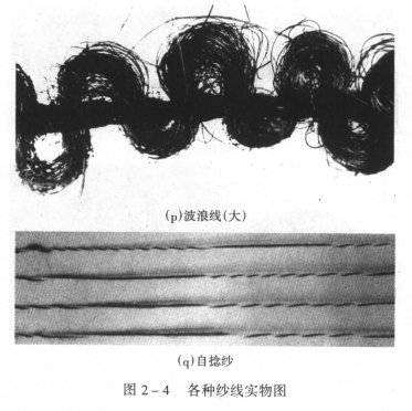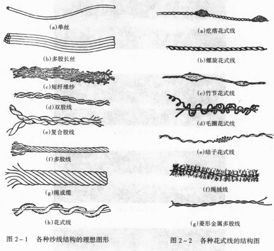 按纱线的结构外形大体可分为10种纱,见表2—1。各种不同类型纱线结构见图2—1所示,图2—1为各种纱线的理想结构,图2—2为花式线结构;图2—3为形体纱和弹力丝结构,图2—4为实物照片。