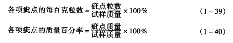原棉庇点是由于生长发育不良和轧工不良而形成的。常见的原棉疵点有:棉结、索丝、带纤维籽屑、软籽表皮、不孕籽、僵片、黄根等。原棉疵点率通常以疵点质量百分率和疵点的百克粒数表示。一般采取手拣的办法,分别计算100g试样中上述各项疵点的粒数和质量百分率,然后将各项疵点的每百克粒数和质量百分率分别相加,即得疵点的每百克总粒数和总质量百分率。疵点粒数的计数为整数;疵点总质量百分率的计算结果按数字修约规则值约到小数点后两位。计算式如下: