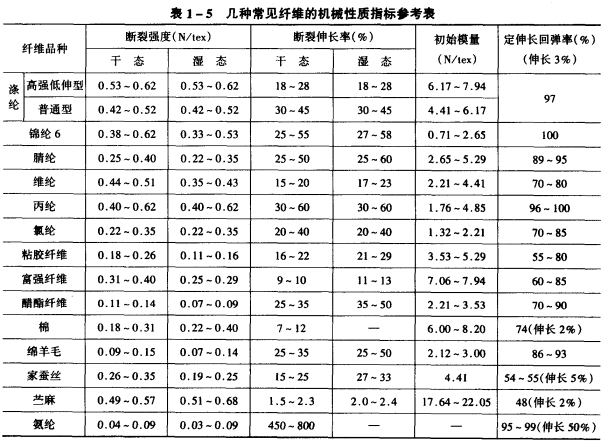 初始模量的大小表示纤维在小负荷作用下变形的难易程度,它反映了纤维的刚性。初始模量大,表示纤维在小负荷作用下不易变形,刚性较好,其制品也比较挺括;反之,初始模量小,表示纤维在小负荷作用下容易变形,刚性较差,其制品比较软。几种常见纤维的初始模量见表1—5。