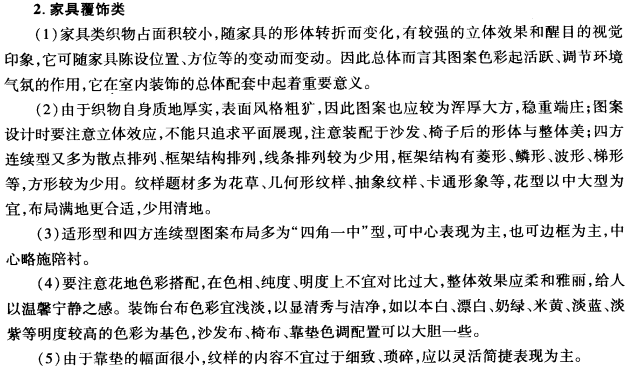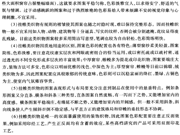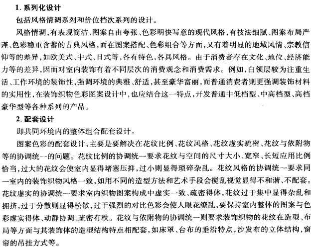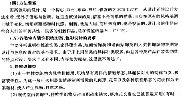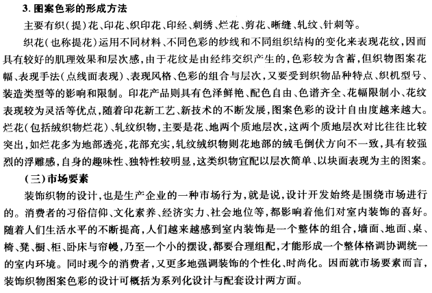 在现代室内环境中,除了室内造型、家具陈设、灯光、绿化等外,还大量使用装饰织物,借助其花纹图案与色彩的效果,协调整个室内的风格基调。装饰织物的图案与色彩设计应综合考虑许多要素,如环境些素、材料结构要求、市场要素等。