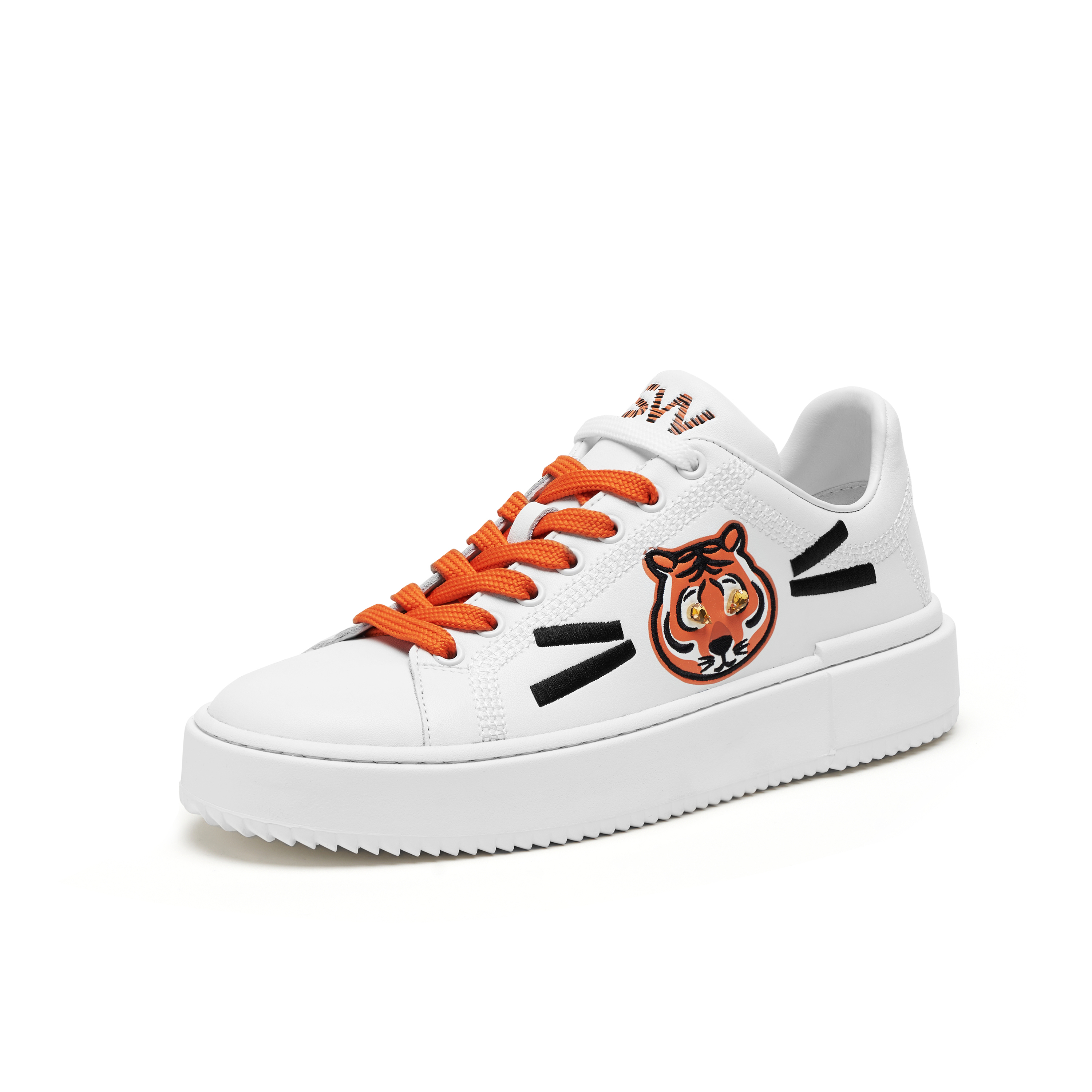 STUART WEITZMAN虎年限定胶囊系列以品牌备受欢迎的经典鞋款RYAN LOW-TOP SNEAKER为原型重新构建,鞋身设计灵感汲取于中国十二生肖农历虎年的传统文化,一侧饰以结合印花和刺绣工艺的萌趣老虎图案,生动的胡须细节和水晶缀饰的老虎眼睛演绎满满活力与生机。另一侧则印有压纹老虎条纹的 SW 标志,受农历新年启发的汉字“寅”也镶嵌其中,将生肖传统与大胆个性完美结合,呈现别具一格的中国新年风。应景的橙黑配色给人眼前一亮的视觉冲击张力,传递着生龙活虎的新姿态,在活力满满的虎年激发更多自信和果敢,迈出虎虎生威的闪耀步伐。