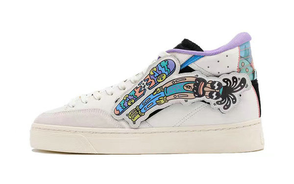 李宁惟吾 180 板鞋进行重塑,同时设计了多款魔术贴徽章供玩家 DIY 造型。鞋跟以手绘图案搭配闪卡材料一同呈现,魔术贴绒毛鞋舌、多材质拼接鞋面以及 DUAL-CUSHION 科技鞋垫、紫色内衬等细节也设计的十分考究。