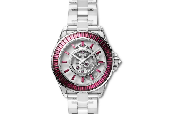 款是著名的J12,该系列问世于2000年。此前为庆祝J12诞生20周年,香奈儿发布了“X-ray”腕表,其表壳和表链均以蓝宝石水晶打造。如今,品牌引入红宝石,将J12提升至新的高度。表圈镶嵌46颗梯形切割红宝石,盘面时标也以相同的材质制成,为腕表带来鲜艳的色彩。机芯底板和桥板同样采用蓝宝石水晶材质,齿轮系和发条盒仿若悬浮在半空中,空灵澄澈。这款腕表限量发行12枚。