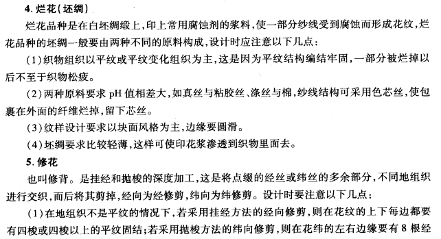 特种工艺的丝织物,是指利用印经、挂经、抛梭、挖梭、换道、修花(背)、烂花、前综等这些比一般丝织品工艺复杂得多的手段对织物进行处理,从而表观丝织品丰富多彩的外观效应。