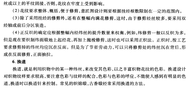 印经的方法是在正式上机织造之前,进行“假织”。所谓假织就是利用一组较差的原料或一组pH值与经丝相关较大的原料作纬与经丝进行交织,织成后经印花后将纬丝去掉,再正式进行织造。假织时,一般纬密较小,但是上机工艺要求较高,织造时,机头与机尾的纬密应较中间大,这样有利于下机后的印花工艺,印经花纹的表面方法要求以块面为主,且面积较大,要考虑织物的感觉与效果,不能精雕细原,要类似于中国画大写意的风格。