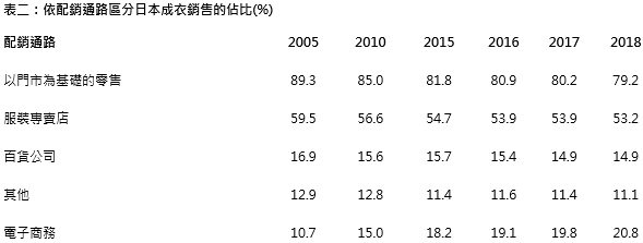 第三,尽管电子商务成长相当迅速,但日本消费者主要仍在实体服装店购物。如表2所示,成衣主要是透过传统和新形式通路组合来贩卖。但尽管电子商务的竞争日益激烈,传统以实体店为销售型态的零售商(如服装专卖店和百货公司)在日本市场中仍扮演着主导地位。截至2018年日本消费者在实体店购买将近80%服装。相较之下,同年在日本只有20%服装是透过网络销售,远低于邻近其他亚洲市场,如中国(32%)、韩国(29%)。日本独特的消费文化和社会规范可能会促进实体服装店表现持续强劲。