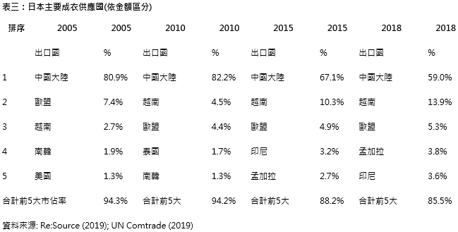 与美国和欧盟的情况相若,日本的时装品牌和零售商也积极寻求其他替代方案。尽管越南、孟加拉国、印尼在产能和市占率仍远远落后于中国,但自这些新兴国家的进口成长速度特别快。如日本大的成衣零售商Uniqlo先前有将近百分之百的商品购自中国。但自2018年起Uniqlo积极展开对越南、孟加拉国、印尼、印度、土耳其的产能进行策略性开发。随着日本时装企业分散供应源,按价值计算,前五大成衣供应国的总市占率从2005年94%,降到2018年的85%左右。