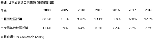第三,有越来越多的日本时装企业自亚洲地区采购。如表四所示,由于区域经济更深度整合和区域纺织成衣供应链更趋有效,日本成衣自亚洲地区进口的比例越来越大。