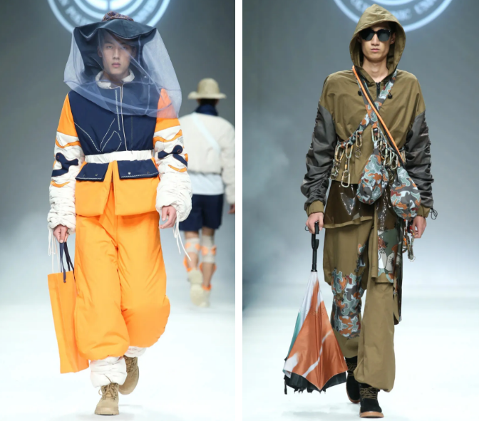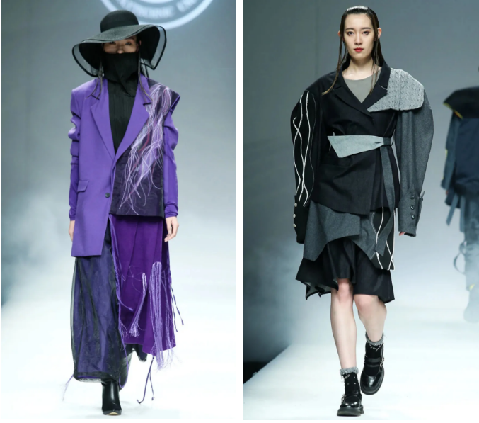 比如用线条的美感来表达山峦间的层次关系,以全新的方式来表现,欲表现出更别样的河山风貌 。将山水间的层叠关系用结构表现,结合流线型的线条进行美化的修饰,主色调是白色与米白色,紫色做为点缀,山水的表现通过衣片的前后层叠及颜色深浅的辅助,构建出全新的山水诠释,与服装进行优雅、前卫时尚的结合。