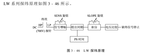 (1)触指式探纬原理:织机运转时,水流及含水的纬丝与探针接触,由于水的导电性,使一定的电流由高压侧探针流向低压侧探针,从而使探纬器信号处理单元接收到所需的纬丝信号。这里接收到的信号包括:纬丝信号、水信号、纬尾信号及漏电信号。探纬信号处理单元就是将此混合信号加以处理,滤去无用信号,保留并放大纬丝信号。信号处理单元利用PS信号进行时段控制,将放大整形后的探纬信号进行计数比较,然后输出工作指令。探纬接收到的波形如图3-45所示。