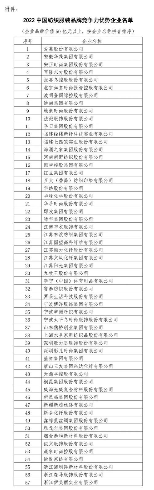 为充分发挥品牌建设对于加快形成“以国内大循环为主体、国内国际双循环相互促进的新发展格局”的重要支撑作用,贯彻落实国家品牌战略任务,在第六个“中国品牌日”之际,中国纺织工业联合会于5月7日发布《关于发布2022中国纺织服装品牌竞争力评价结果的决定》(中国纺联〔2022〕12号),通过开展品牌价值评价,遴选确定“2022中国纺织服装品牌竞争力优势企业”,共57家企业入围。