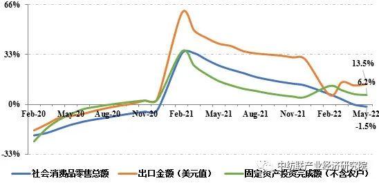 二季度以来,受国际环境复杂严峻、国内疫情冲击等超预期因素影响,我国宏观经济运行下行压力有所加大,多项经济运行指标大幅走弱。统计数据显示,1~5月,全国社会消费品零售总额同比减少1.5%,固定资产投资完成额(不含农户)同比增长6.2%,规模以上企业工业增加值同比增长3.3%,利润总额同比增长1%,增速较1~4月分别放缓1.3、0.6、0.7和2.5个百分点。在物流堵点逐步打通、前期积存订单交付和稳外贸政策推动下,出口保持回升态势,1~5月我国商品出口总额(美元计价)同比增长13.5%,增速较1~4月提升1个百分点。5月中下旬以来,企业复工复产和物流保通保畅持续推进,宏观经济初现恢复势头,带动制造业景气水平回升至扩张区间,6月我国制造业PMI为50.2。