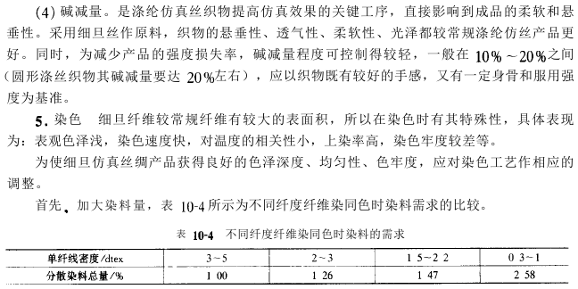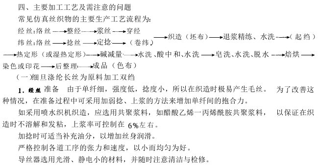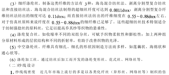 近几十年,高分子单体合成的化学纤维大量进入纺织原料市场。因其原料丰富,价格便宜,在保持其优良的物理机械性能基础上开发具有真丝绸风格的产品(即化纤仿真丝产品),既可大大改善化纤的使用性能,也为服装面料开辟了一个广阔的天地。
