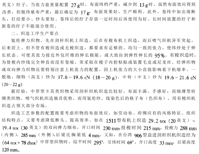 氨纶纬弹织物经向采用普通纱,故其经纱工艺较为简单,筒、经、浆工艺可参照普通非弹织物工艺。氨纶纬弹织物的纬纱、氨纶经弹织物的经纱和氨纶双向弹力织物的经纬纱均为弹力纱,其工艺应按照弹力纱的特点加以配置。在准备工序中应对张力严加控制,如果使用张力不匀的织轴或管纱,布面可能出现起皱、幅宽不等等疵点。