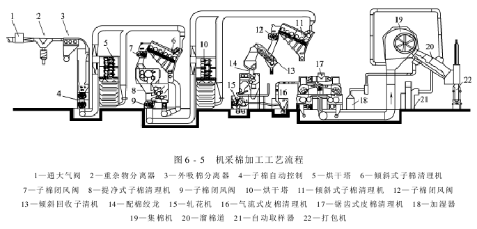 图6-5所示的是机采棉加工工艺流程。相对于手摘棉的棉花加工工艺而言,该工艺增加了子棉烘干次数、子棉清理次数(在次子棉烘干之后增加了用于清除棉铃、铃壳、棉枝等杂质的提净式子棉清理机,并在、第二次子棉烘干之后均采用了兼有子棉分离作用的倾斜式子棉清理机)和皮棉清理次数(采用一次气流式皮棉清理和两次锯齿滚筒式皮棉清理),增加了皮棉加湿。